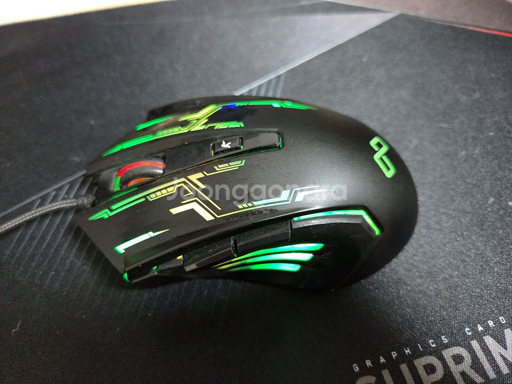 RGB 조명이 있는 게이밍 마우스예요. 블랙 바디에 그린 LED가 멋지게 들어와 있고, 상태도 깨끗해 보입니다. 게임용으로 사용하기 좋은 고성능 마우스네요!