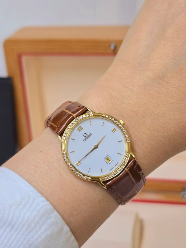 ○ 사이즈: 31mm(용두제외) ○ 구성: 케이스, 감정서. ○ 컨디션: 아주 좋아요 ○ 무브먼트 : 쿼츠식(건전지). 얼마전에 새 기계(정품)로 교체했습니다. ○ MADE IN SWISS 오메가만의 깔끔하고 클래식한 디자입니다. 18k 도금 아니고 금통18k골드 재질입니다. 베젤다이아 장식과 아이보리다이얼로 너무나 고급스럽고 반짝반짝 빛이 납니다.착용하실때 더욱 부티납니다. 정장이나 캐쥬얼 다 잘 어울립니다. 시계 정상 작동 입니다. ◇◇ 100% 정품이며 아닐시 100% 환불해드립니다. 안심하고 구매하십시오. □구매후 교환 환불 어렵습니다. 양해부탁드립니다^^