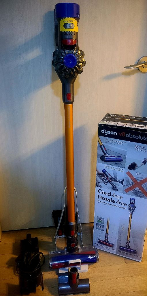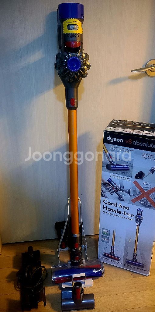 다이슨 V8 앱솔루트 직구 무선 청소기 년식이 있다보니 맥스 모드로는 잠깐잠깐 밖에 못씁니다. 기본모드로는 아파트 정도는 문제 없습니다. 아답터 돼지코 제공 - 다양한 종류의 헤드 포함되어 있습니다 - 강력한 흡입력으로 깨끗하게 청소할 수 있습니다 - 벽걸이 충전 거치대와 박스도 함께 드립니다