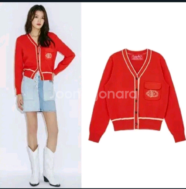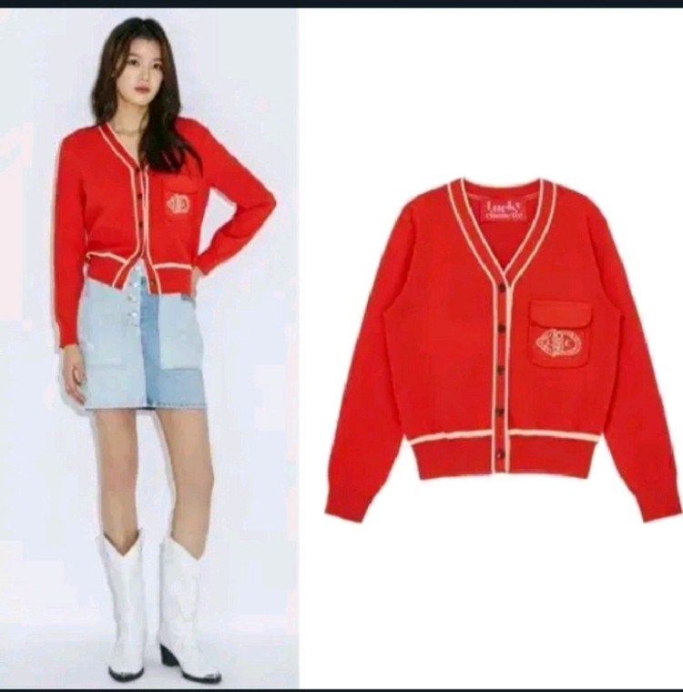 럭키슈에뜨 레드 컬러 가디건입니다 숏 기장으로 귀여운 느낌을 줍니다 가슴 부분에 럭키슈에뜨 엠블럼 장식이 포인트입니다 거의 새수준이에요