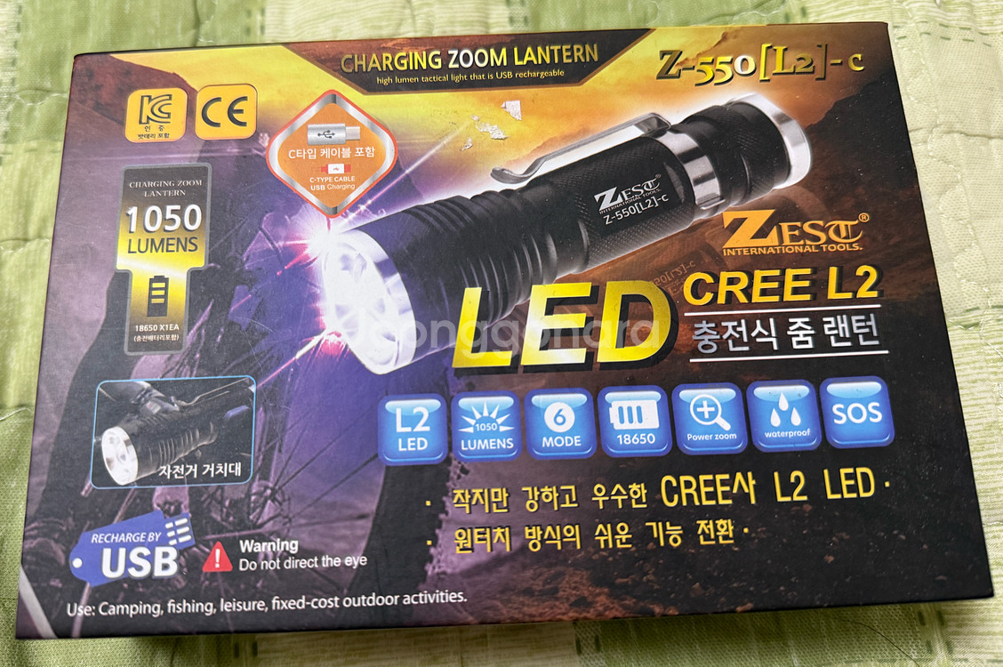 ZEST 충전식 줌 랜턴 Z-550[L2]-C입니다 - CREE L2 LED를 사용하여 밝고 강력한 빛을 제공합니다 - 1050 루멘의 밝기로 어두운 곳에서도 시야를 확보할 수 있습니다 - 6가지 모드를 지원하여 다양한 상황에 맞게 사용할 수 있습니다 - 생활 방수 기능이 있어 비오는 날에도 안심하고 사용할 수 있습니다 - SOS 기능이 있어 비상 상황 시 유용하게 사용할 수 있습니다 - C타입 케이블과 자전거 거치대가 포함되어 있습니다