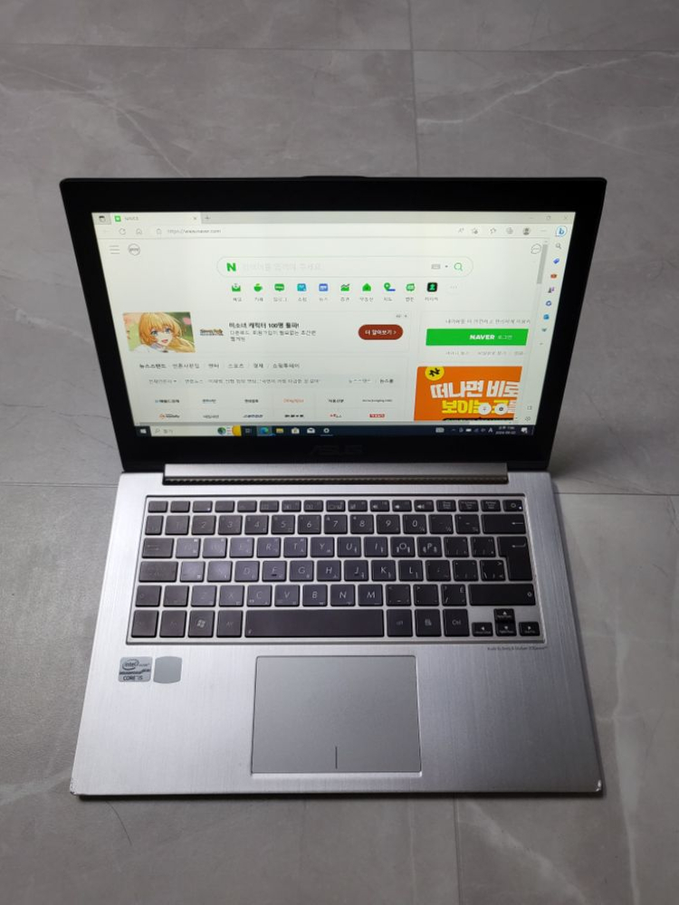 ASUS 13.3인치 풀HD 슬림노트북 13.3인치 얇은 노트북입니다. 외관도 고급 알류미늄으로 되있어요. 알만한 사람은 다 선호했던 고급 노트북 입니다. 키보드도 LED조명이 들어오는 발광키보드. 출고시 비쌌던 노트북입니다. 성능좋은 저전력 i5 3317U 탑재 *램-4기가 .SSD-128기가장착으로 부팅및 속도 잘 나옵니다. 10초부팅 가능합니다. USB3.0단자 있어요. 그래픽은 인텔HD그래픽 입니다. 웹캠 장착되어있고 고감도 무선랜 탑재되어있습니다. 생활기스는있지만 액정및 외관상태 좋아요.(실사확인) 터치패드가 잘 않돼 USB키보드 동봉합니다. 액정상태 좋아요. 밧데리는 완충시 3시간 정도부터 시작합니다. 윈도우10깔려있고 한글.오피스및 *기본프로그램 설치. *바로 사용하시면 됩니다. 노트북.어댑터 발송됩니다.