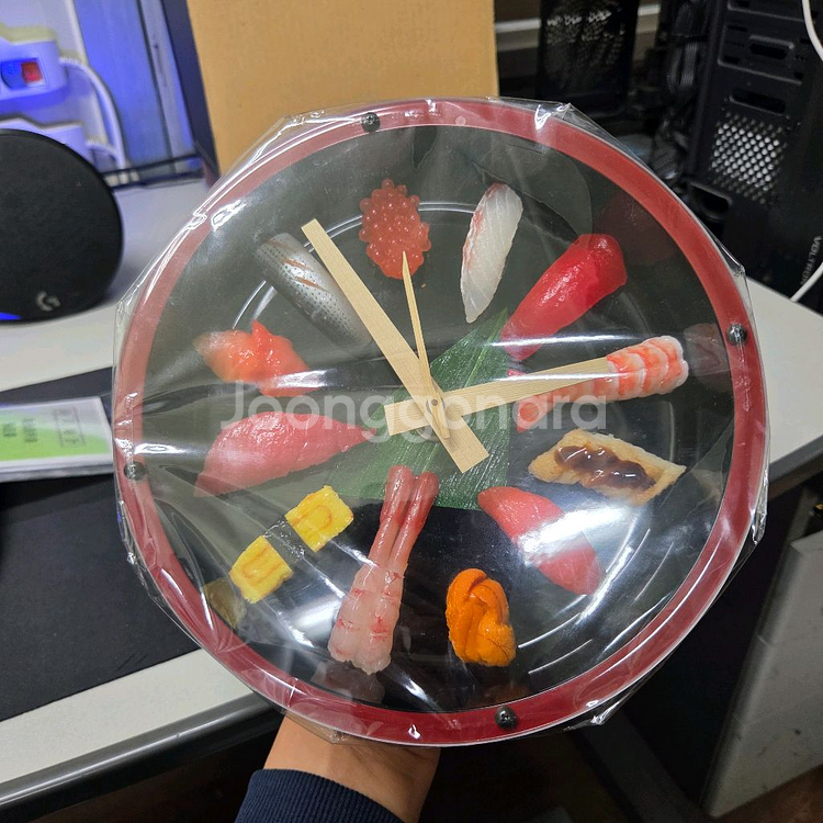 나혼자산다 이장우님이 사용해서 유명해진 스시 벽시계입니다. 포장도 안 뜯은 새상품입니다. 초밥 모형이 정교해서 인테리어 소품으로 활용하기 좋습니다. 별도 문의 없으시면 바로 안전결제 부탁드려요! 다양한 종류의 달콤한 스시가 그려진 귀여운 유리 벽시계예요. 실제 시간을 표시하는 손대와 함께 구성되어 있고, 상태도 깨끗해 보입니다. 인테리어 소품으로 정말 예쁠 것 같아요!