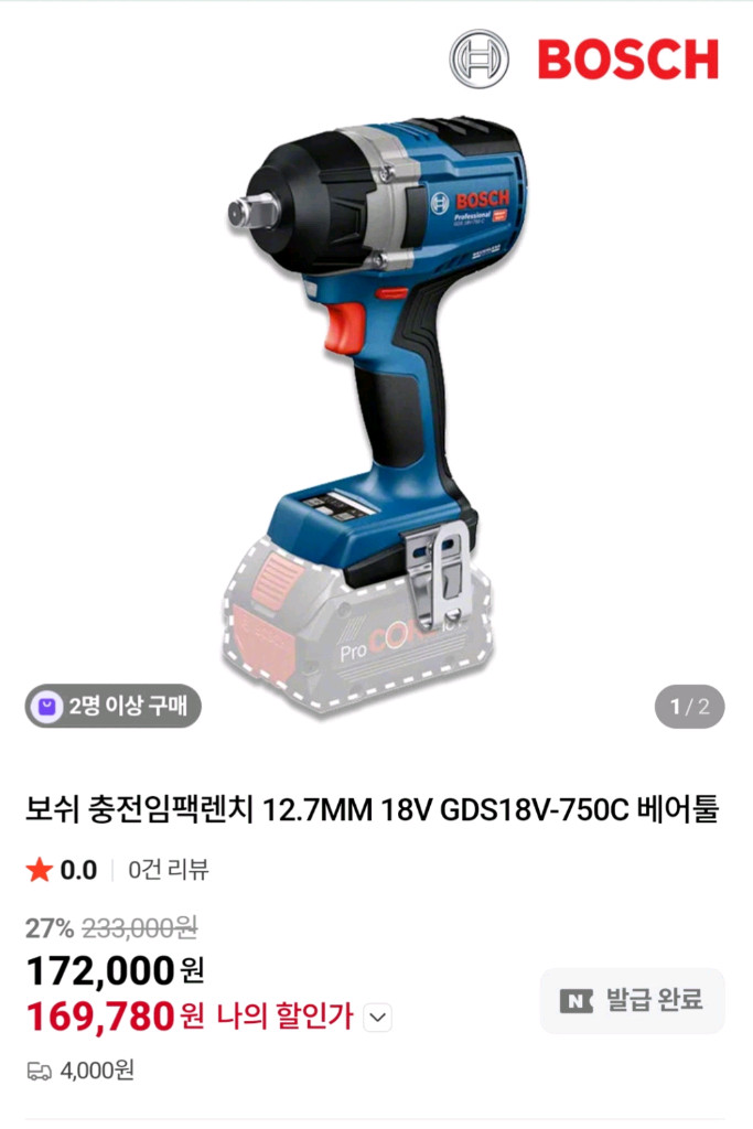 보쉬 GDS 18V-750 C 임팩트렌치 배송비무료 26년1월1일 구매