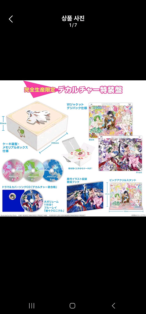 마크로스 프론티어 올 타임 베스트 앨범 완전 수주 한정 생산판 입니다. - 구성품 모두 있고, 아크릴 스탠드 미개봉 입니다. 중고 제품인 관계로 구매후 환불/교환 어려운 점 양해 부탁드리겠습니다 『마크로스F』, 2008년 TV 방송 이후 17년의 세월을 거쳐 완벽무결한 올타임 베스트 앨범을 발매하였습니다! 셰릴과 란카가 서로의 노래를 부르는 드라마 & 커버송 CD 기획도 있습니다! 「사랑받은 지 17년」 『마크로스F』는 2008년 TV 방송 이후 17년의 세월을 거쳐 완벽무결한 올타임 베스트 앨범을 발매하였습니다☆ 과거 앨범에 수록되지 않은 『극장 단편 마크로스F ~시간의 미궁~』 주제가 「시간의 미궁」, 「사크리파이스」, 「Good job!」를 수록한 완전무결한 올타임 베스트 앨범을 '은하의 요정' 셰릴 노움의 생일(11월 23일)에 대공개합니다! 전 은하가 기다려온 발매일은 '초시공 신데렐라' 란카 리의 생일인 4월 29일입니다☆ ■한정판 특전 CD에는 셰릴과 란카가 서로의 곡을 부르는 드라마 & 커버송 기획 「데칼쳐 노래 대전」이 수록되어 있습니다. ■완전 생산 한정·데칼쳐 특장판에는 한정판에도 동봉된 드라마 & 커버송 CD에 더해, 과거 라이브 다이제스트 영상 등을 모은 「멍멍 크로니클」이 수록된 블루레이와 아크릴 스탠드가 포함되어 있습니다. ■초회 생산분(3형태 공통)에는 2025년 7월 26일~27일(사오토메 알토 생일)에 K 아레나에서 개최되는 『마크로스F』 사상 최대 규모의 단독 라이브 「SANKYO presents 마크로스F 갤럭시 라이브☆파이널 2025년 티켓 선행 신청 시리얼 코드를 동봉하였습니다. ■ 재킷은 『마크로스F』 캐릭터 디자인을 담당하는 에바타 리사가 새로 그린 일러스트입니다! ■『마크로스F』 최초의 아날로그판도 동시에 발매됩니다☆ (완전 생산 한정·데칼쳐 특장판 특전) 1. 드라마&커버송 CD 「데칼쳐 노래 대전」 내용: 사오토메 알토의 생일을 축하하기 위해 '은하의 요정' 셰릴 노움이 란카의 노래를, '초시공 신데렐라' 란카 리가 셰릴의 노래를 부르는 전대미문의 데칼쳐 노래 대회(노래방 대회)가 개막합니다! 심사위원은 알토 단 한 명뿐입니다…! 출연(드라마 파트): 사오토메 알토(CV: 나카무라 유이치), 셰릴 노움(CV: 엔도 아야), 란카 리(CV: 나카지마 애정) 각본: 요시노 히로유키 2. 블루레이 『멍멍 크로니클』 내용: 과거 라이브 다이제스트·「Merry Christmas without You」녹음 현장 메이킹 무비 3. 아크릴 스탠드 4. 메모리얼 박스 사양 (한정판 특전) 1. 드라마&커버송 CD 「데칼쳐 노래 대전」 2. 스페셜 케이스 사양 (초회 생산분 한정) (3형태 공통) 마크로스F 갤럭시 라이브☆파이널 2025년 티켓 선행 신청 시리얼 코드를 동봉하였습니다. (수록 곡) 『시간의 미궁』『사크리파이스』『Good job!』 등 ※수록곡은 모든 사양에 공통입니다. ※수록 내용은 변경될 수 있습니다.
