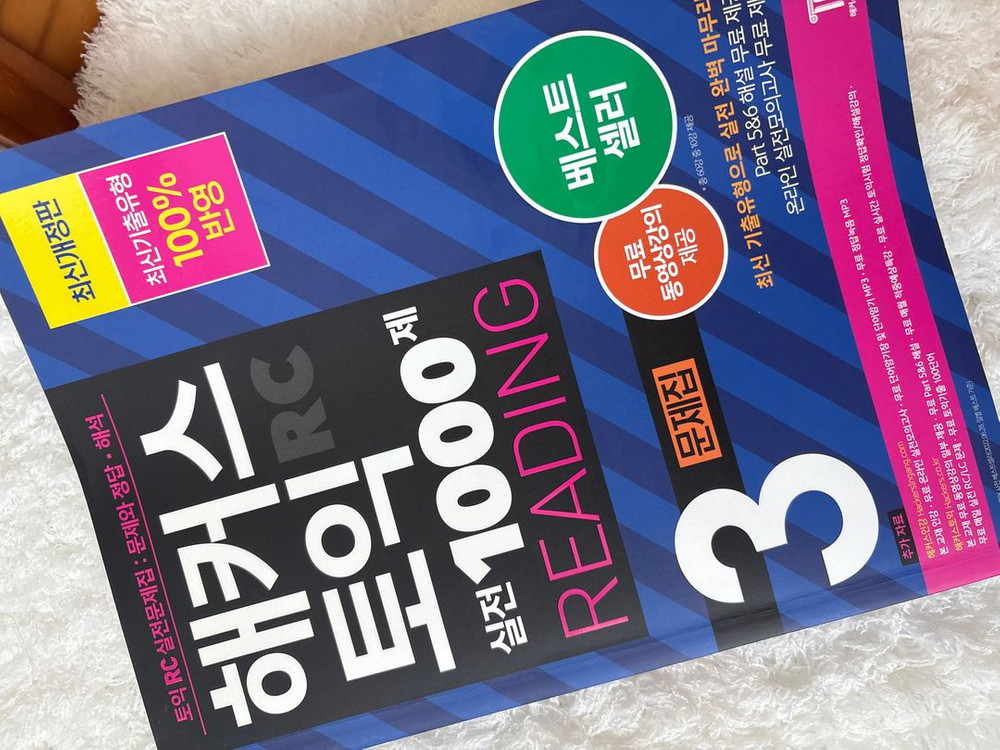 해커스 토익 실전 1000제 READING 3 문제집 판매합니다. 실전 대비용으로 유명한 교재이고, 난이도 있는 문제로 점수 올리기 좋습니다. 6회차만 풀려 있고, 그 외 나머지 회차는 사용하지 않아서 새 책과 거의 다름없는 상태입니다. 전체적으로 깨끗한 편이고, 문제 푸는 데 지장 없습니다. 실전 감각 올리거나 고득점 목표로 연습하실 분들께 추천드립니다. 필요하신 분 연락 주세요.
