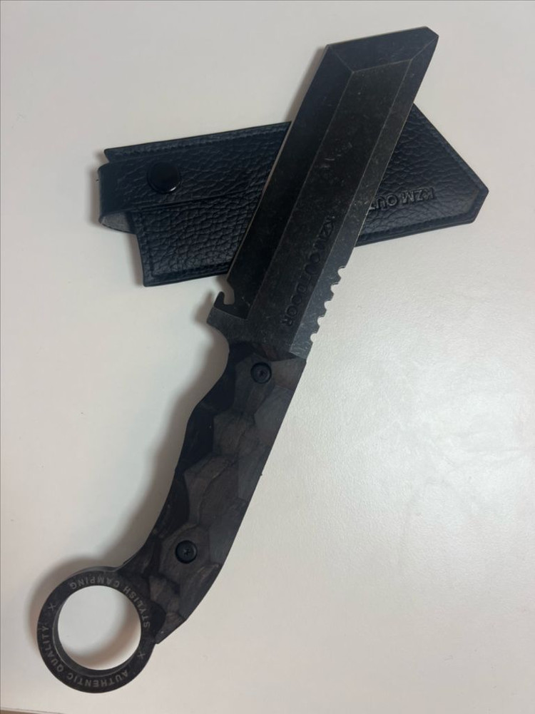 카즈미 필드 레오칸 나이프 캠핑용이어서, 장작 쵸핑 등에 쓰기에 적합하고 (튼튼) 다쓴 부탄가스통 뚫는 팁 같은거 있습니다. 캠핑할때 걸어두면 예쁠것 같네요 미사용 전시용입니다.