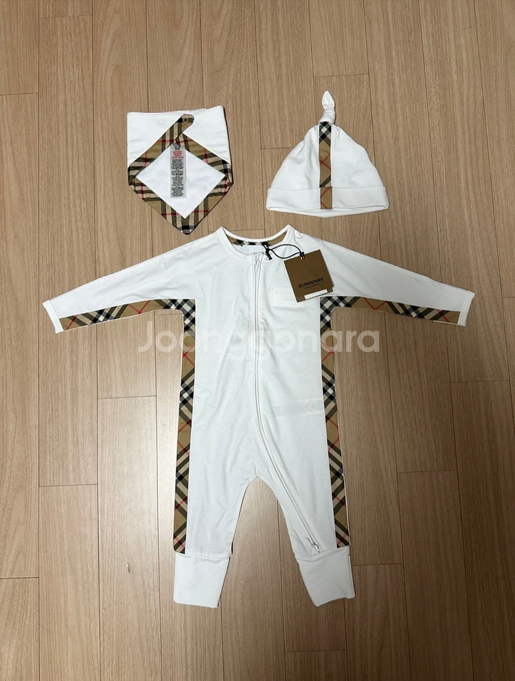 버버리 베이비 우주복, 모자, 턱받이 세트입니다 - 사이즈 : 6M - 미착용 새상품입니다 - 선물 받은 그대로 포장해서 박스에 넣어 드립니다 정품 신생아 바디수트와 모자, 머플러가 포함된 완전 새상품이에요. 화이트 베이스에 시그니처 체크 패턴이 포인트로 들어가 있어서 고급스럽고 예뻐요. 태그도 그대로 달려있어서 선물용으로도 좋을 것 같아요!