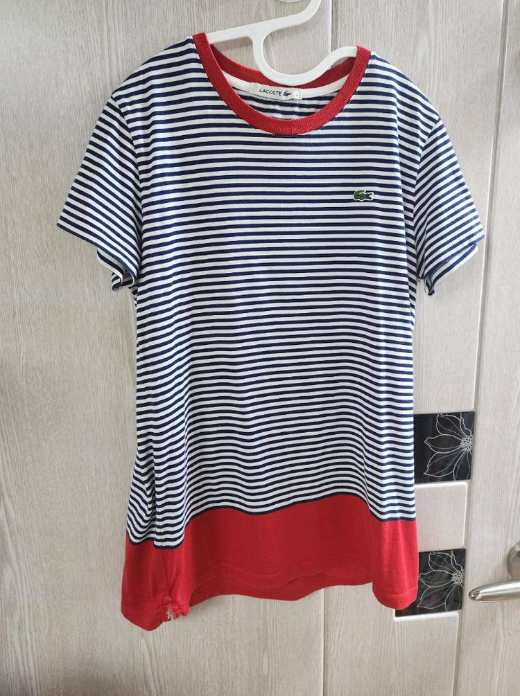 라코스테 정품 스트라이프 반팔 티셔츠예요. 네이비와 화이트 줄무늬에 레드 배색이 포인트 깔끔하면서 스타일리시한 옷 상태 양호