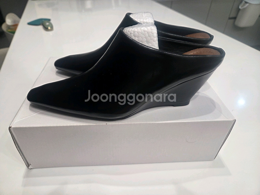 블랙 웨지힐 뮬이에요. 박스도 함께 있고 상태 양호합니다. 세련된 포인티드 토와 적당한 굽 높이로 오피스룩이나 정장 스타일에 잘 어울려요. 사이즈235