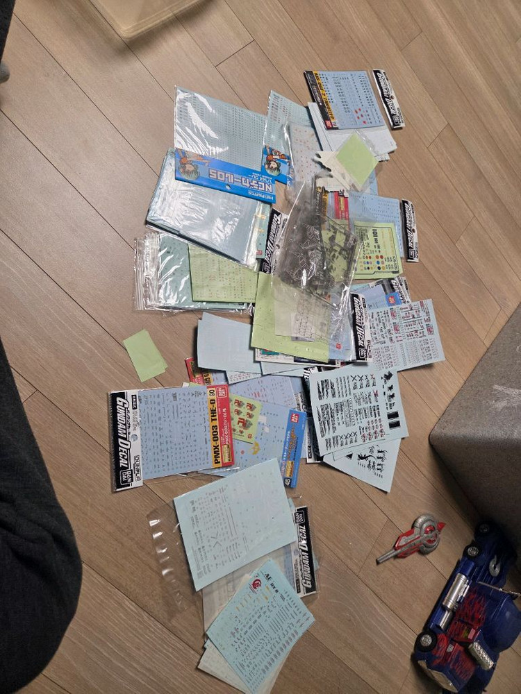 건담 데칼,각종 무기들, 빔샤벨파츠,엑시아 환장파츠 등등 데칼 대부분 따로 구매한 반다이 정품데칼이고 사제 데칼도 있고 쓰다만 에칭파츠도 좀 있어요 데칼 대충 펼쳐놓았는데 장수로는 대략 50장쯤. 대부분 미개봉 상태입니다 데칼만 대충 계산해도 이득이십니다 건담 각종 무 mg hg 섞여있고 대부분 mg 빔샤벨 이펙트 파츠 역시 mg hg섞여있슴 mg엑시아 리페어 환장파츠 따로 밀봉해둔것으로 보아서 환장에 필요한 부분 다 있을것 같은데 확실치 않음. 안에 헤드, 파손 무기, 망토 등등 있고 조립 안한 런너들 같이 밀봉되있는것으로 볼때 다 있을것 같아요 부스터 이펙트 파츠와 폴리캡 조금