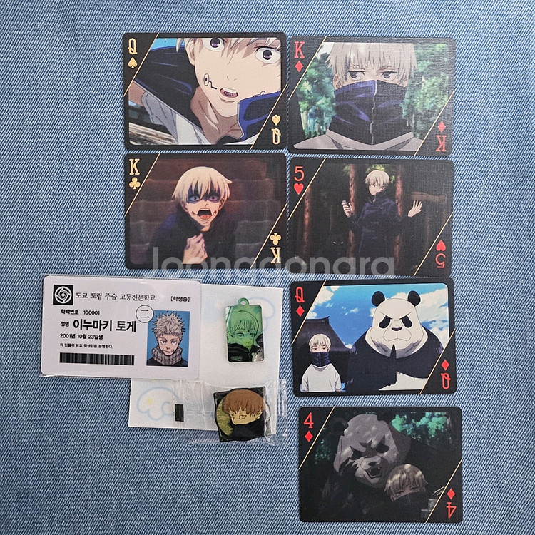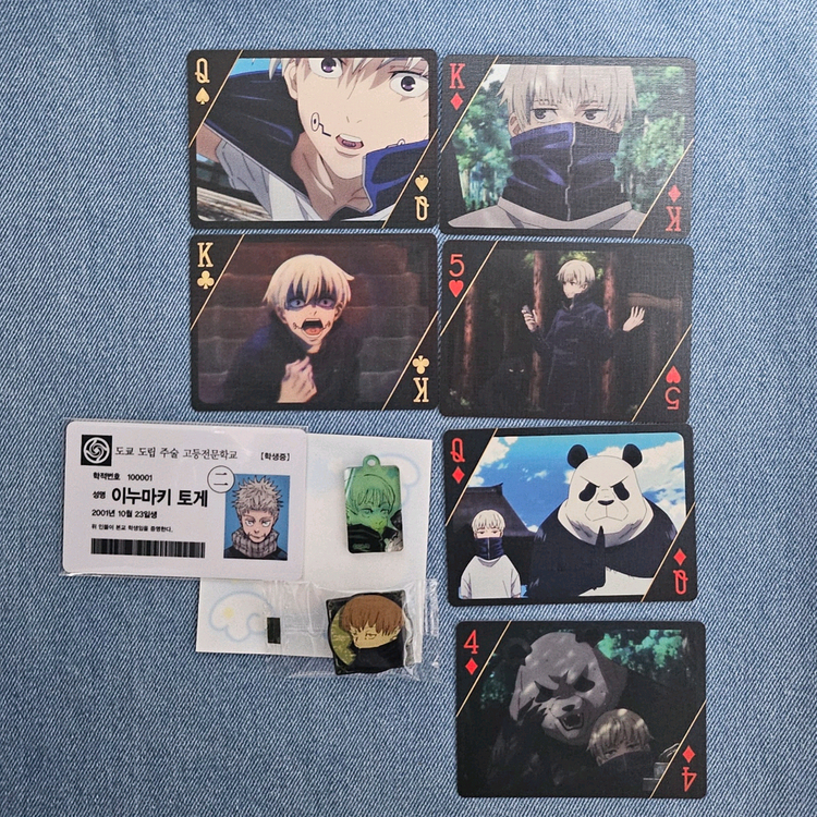 주술회전 이누마키토게 굿즈 일괄 처분합니다. 18권 특전 부록 핀 배지 20권 특전 아크릴 참 학생증 펀딩 트럼프 카드 중 토게 일러스트 카드 모두 새 제품이며 군번줄 챙겨드립니다. 일괄로만 판매합니다.