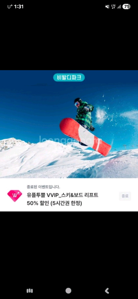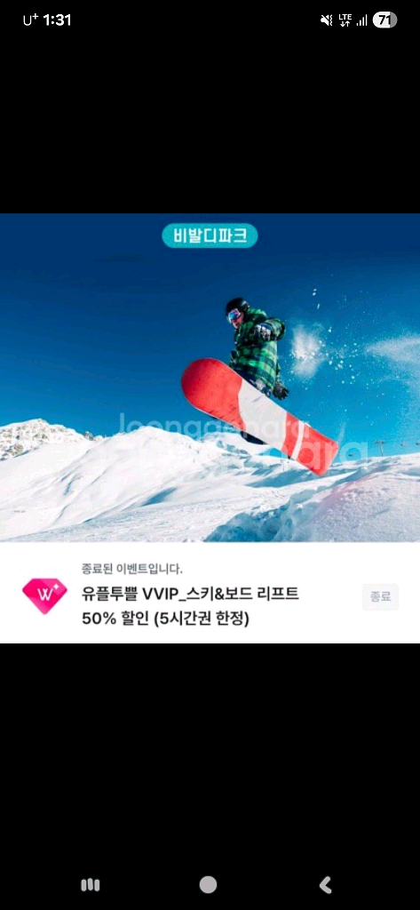비발디파크 스키&보드 리프트 50% 할인 (5시간권 한정) 세장가능. 26년 3월 2일까지 쿠폰 다운로드 > 비발디파크 스키장 현장 매표소 방문 > 쿠폰 사용 [직원확인] > 할인가로 구매 후 이용 입금 확인 후 바코드 보내드려요 바코드 노출 후 환불 불가 채팅 주세요
