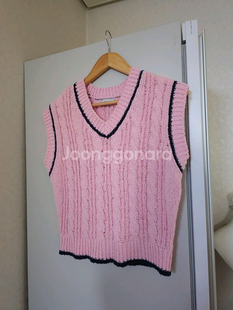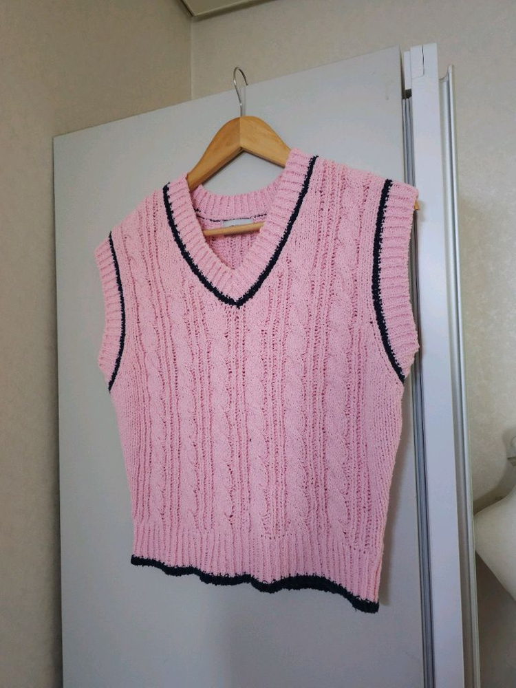 어몽 꽈배기 조끼 베스트입니다. 핑크색에 검정색 라인으로 포인트를 준 옷입니다. 재질은 면으로 되어있습니다. 한여름빼고 다 가능한 소재. S사이즈, 가슴반품 47cm 총장 52cm