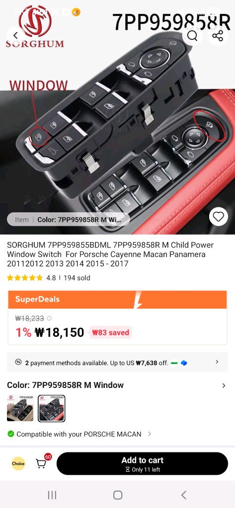 알리에서 구입했는데 제 차량에는 맞지 않아 판매합니다. https://a.aliexpress.com/_c3Ai3Lc1 포르쉐 카이엔, 마칸, 파나메라 차량용 윈도우 스위치 모델 번호는 7PP959855BDML 및 7PP959858R이며, 2011-2017년식 차량과 호환됩니다 새 제품이며, 박스에 포장되어 있습니다 4번째 핀 사진 참고하셔서 본인 차량에 맞는 지 확인해주셔야 힙니다.