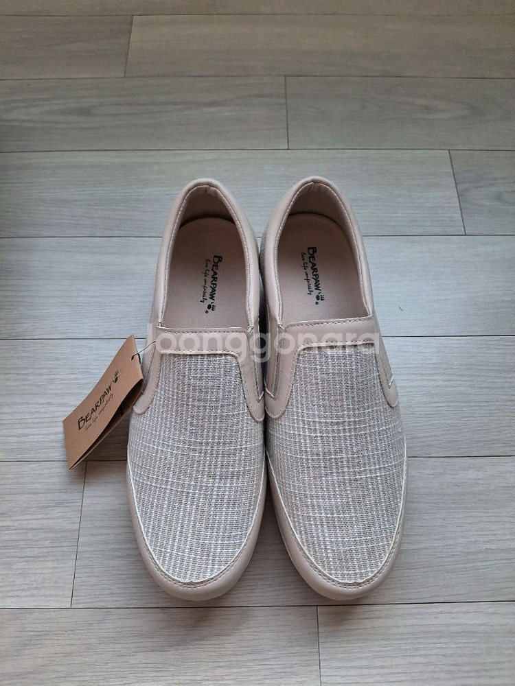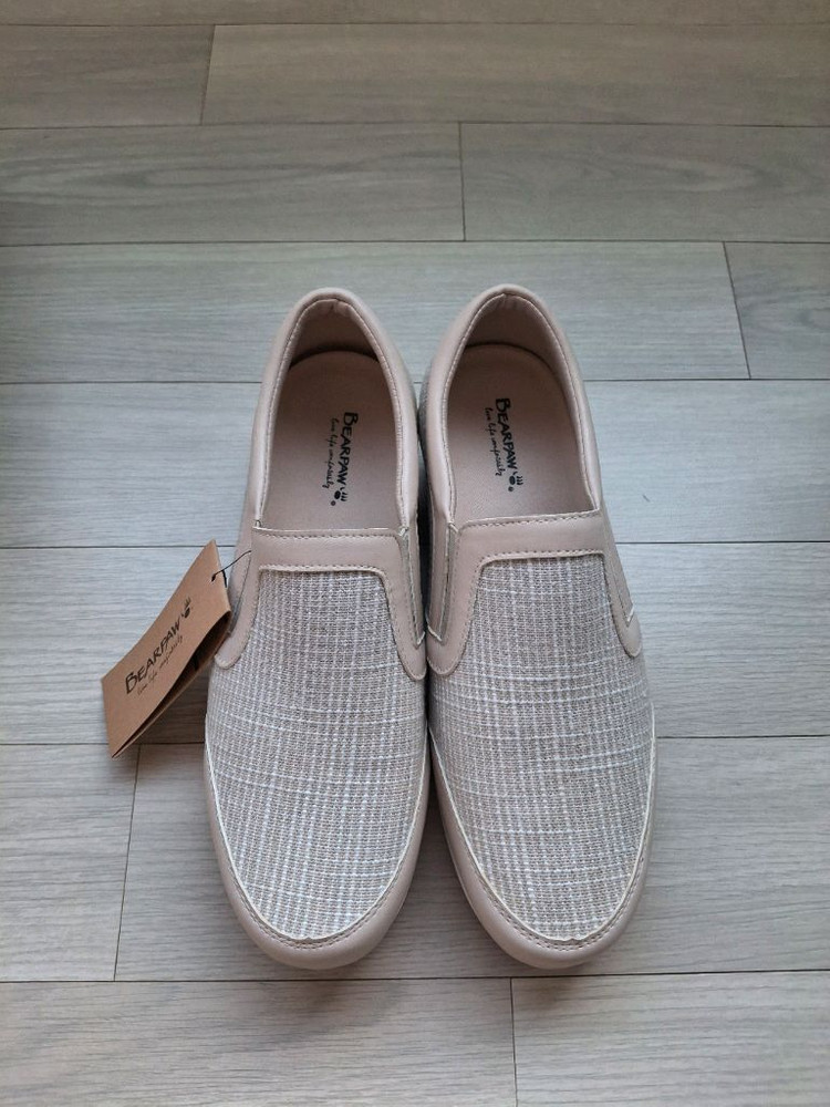 새상품 여성용 슬립온 운동화예요. 박스와 태그 모두 그대로 있는 미착용 상태입니다. 편안한 착용감과 깔끔한 베이지 컬러로 데일리 착용하기 좋아요.
