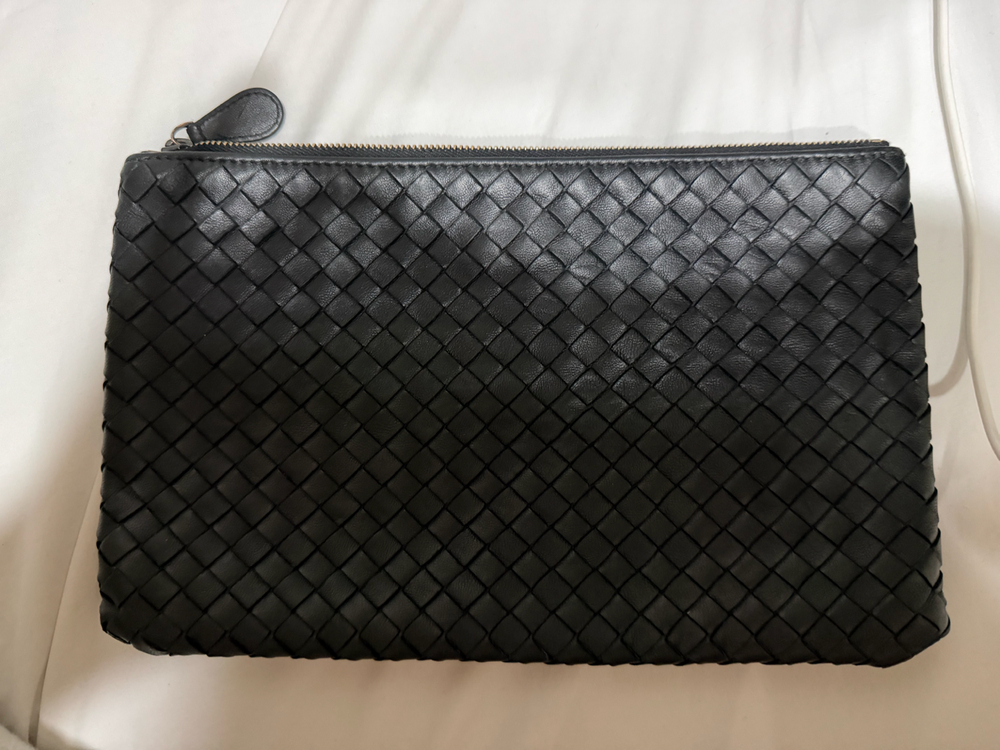 시그니처 인트레치아토 위빙 패턴의 블랙 클러치백이에요. 지퍼와 손잡이가 포함되어 있고, 내부도 깔끔한 상태입니다. 고급스러운 가죽 소재로 실용적이면서도 세련된 디자인이 매력적이에요.