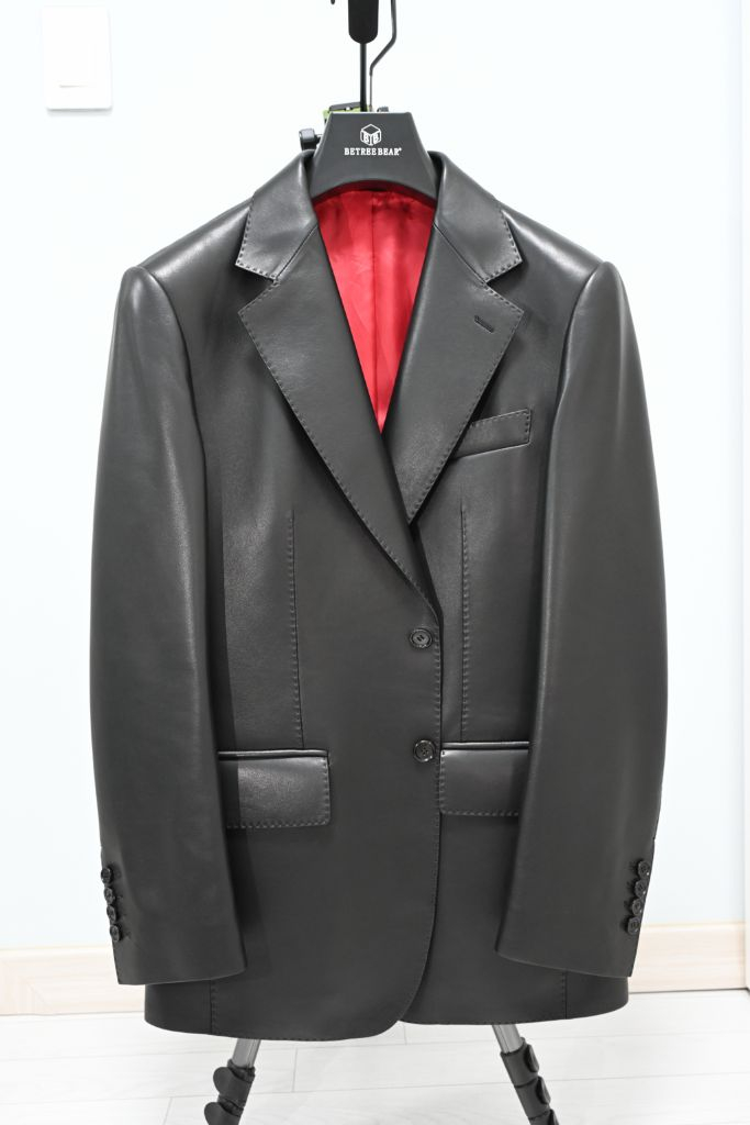 고급스러운 블랙 가죽 정장 재킷이에요. 안감은 빨간색으로 포인트가 되어 있고, 전체적으로 상태가 양호해 보입니다. 비즈니스나 특별한 자리에 착용하기 좋을 것 같아요. 남자 양가죽 자켓 95-100사이즈 어깨 46 가슴 104 길이 74 소매길이 61 60만원에 구매후 시착만했습니다.