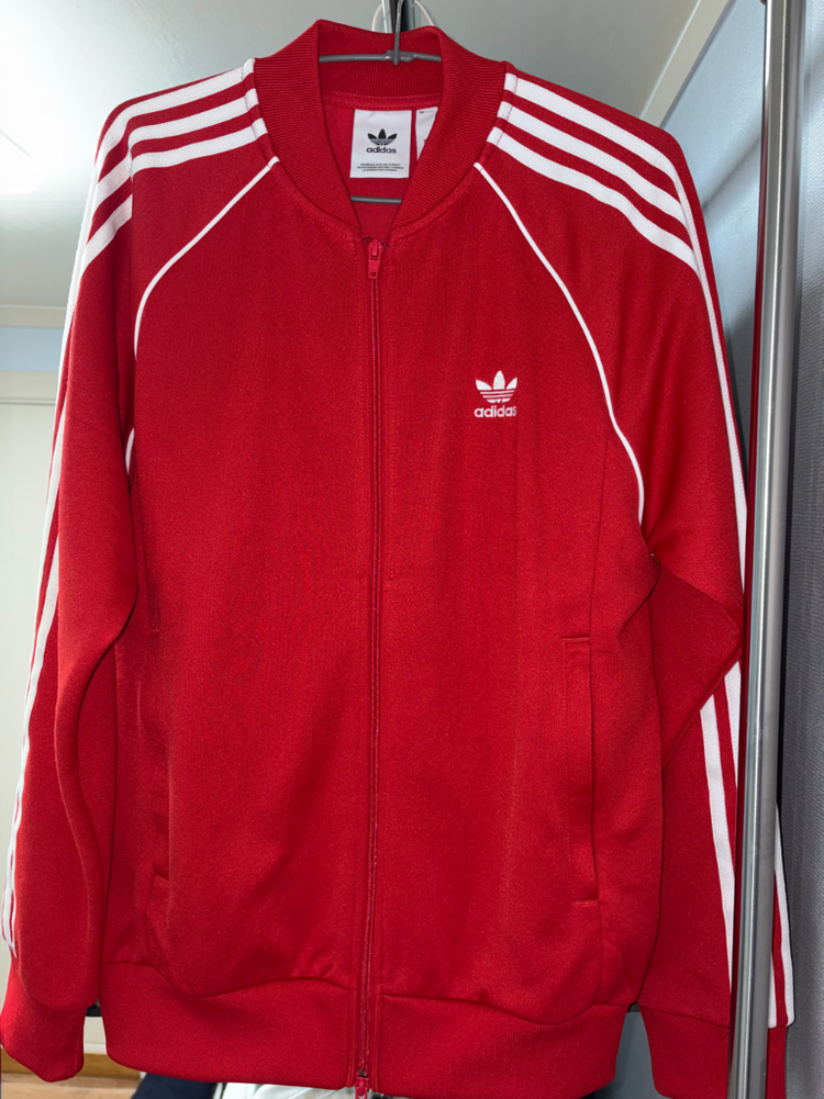 아디다스 슈퍼스타 트랙탑 상의 단품입니다. 쨍한 빨간색에 흰색 삼선 포인트가 힙하고 예쁩니다. 사이즈는 XL이며 구입 후 딱 두번 착용한 새것이나 다름없는 상품입니다. 댓글이나 010-4오ll-3둘9하나 로 문자 주세요!