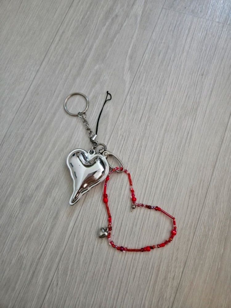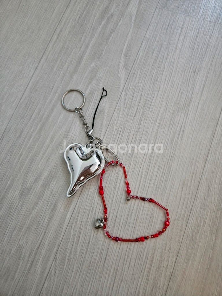 실버 하트 모양 키링이에요. 빨간 비즈가 연결된 디자인으로 상태 양호합니다. 실용적이면서도 예쁜 아이템이라 선물용으로도 좋아요!