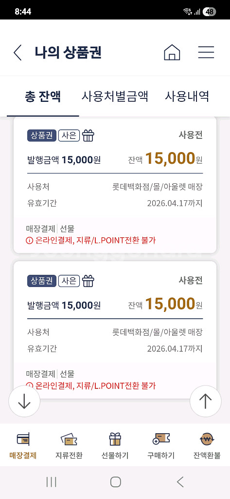 선물하기로 보내드립니다 매장서 결제만 가능 사은으로 받은거라 지류 교환.엘포인트 전환 안되요 매장서 직접 사용하실분 구매하셔요 010 4911 0879