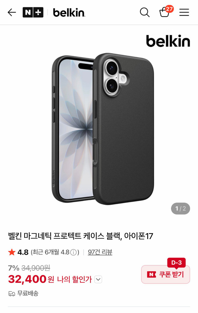 아이폰17용 벨킨 SheerForce 프로텍트 마그네틱 케이스 블랙색상 단순개봉 미사용 상품입니다 택배비포함1.8만원에 팝니다!