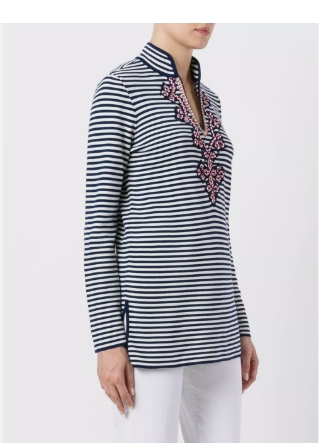 토리버치 TORY BURCH 자수 디테일 튜닉 니트 S사이즈 사이즈 S 총장 74 (앞 68.5) 가슴반품 45 토리버치 TORY BURCH 진네이비 아이보리 컬러의 고급스러운 튜닉형 니트입니다 사이즈 S 로 55정도이고 보통 니트 소재로 봄 가을에 입기 괜찮아요 신축성 있는 소재이고 오픈 칼라이며 네크라인쪽 자수 디테일 , 밑단 사이드 슬릿 있어요 스트라이프 패턴 디자인으로 캐쥬얼하고 여성스럽게 연출하시기 좋으시고 미세한 사용감정도에요 예민하신 분 연락 사양하며 사진 그대로 상태로 컨디션 좋아요