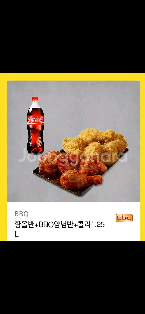황올반+양념반+콜라 1.25 4000원 할인 정가 26500원 원하시면 비비큐 앱or매장에서 다른 상품으로 교체해서 주문 가능하세요