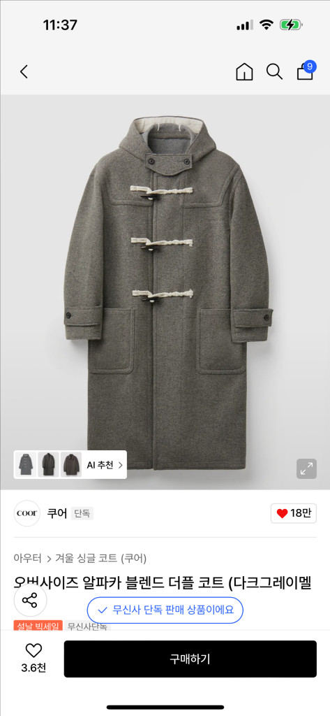 쿠어 오버사이즈 더플코트 그레이 s