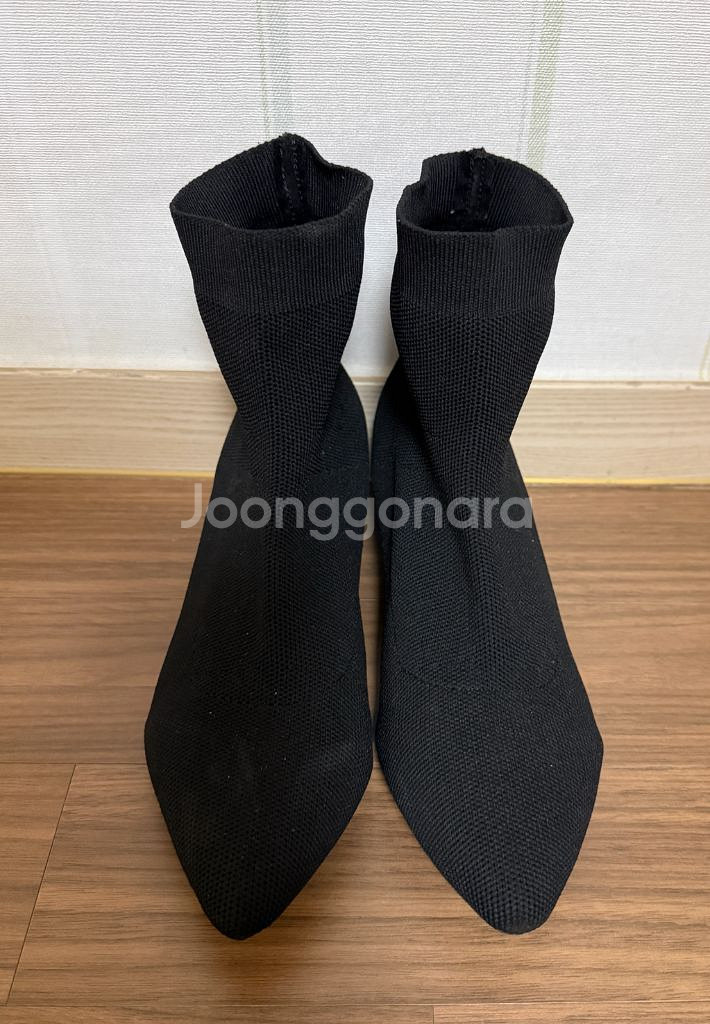 쫀쫀한 니트 소재 앵클부츠 블랙 색상입니다. 굽 높이는 적당해서 신고 다니기 편할 것 같아요. 특별한 오염이나 하자는 없습니다. 반택, 착불 택배 가능해요.