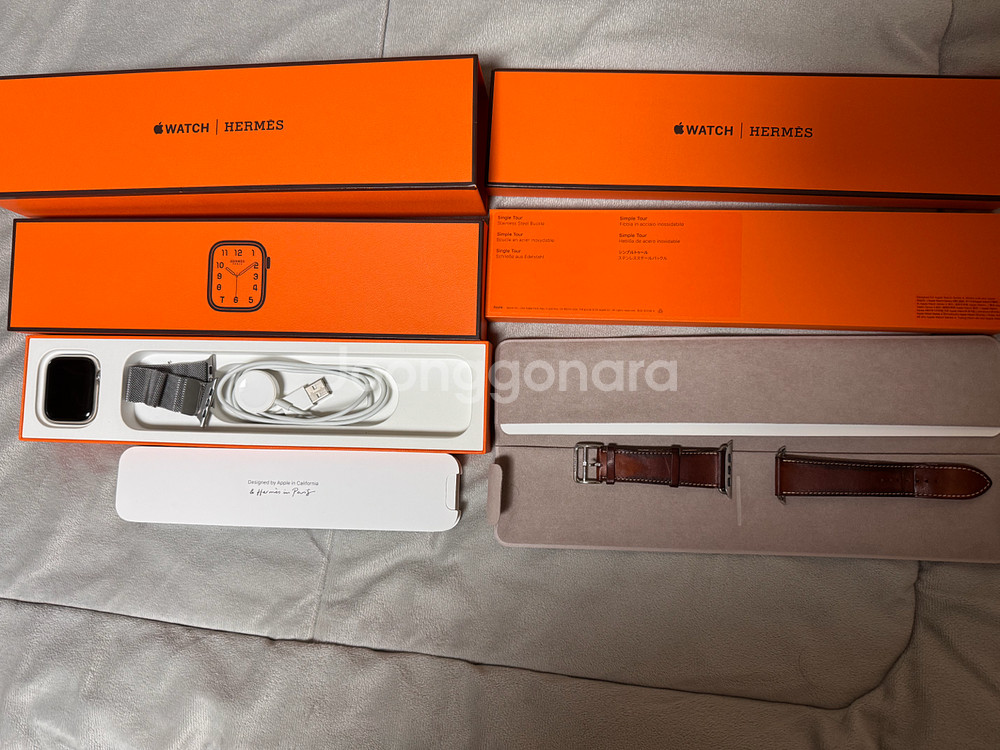 애플워치 7 에르메스 45mm 스테인리스 스틸 케이스 모델입니다 - GPS + Cellular 모델 - 배터리 성능 최대치 83% 구성품은 사진에 보이는 것과 같으며, 애플 정품 충전케이블과 에르메스 정품 가죽 줄입니다(사용감 많음) 밀레니즈루프는 비정품입니다 Apple Watch Series 7은 긁힘에 강한 전면 크리스탈을 사용하여 뛰어난 내구성을 자랑합니다 또한 Always-On Retina 디스플레이로 더욱 편리하게 사용할 수 있습니다