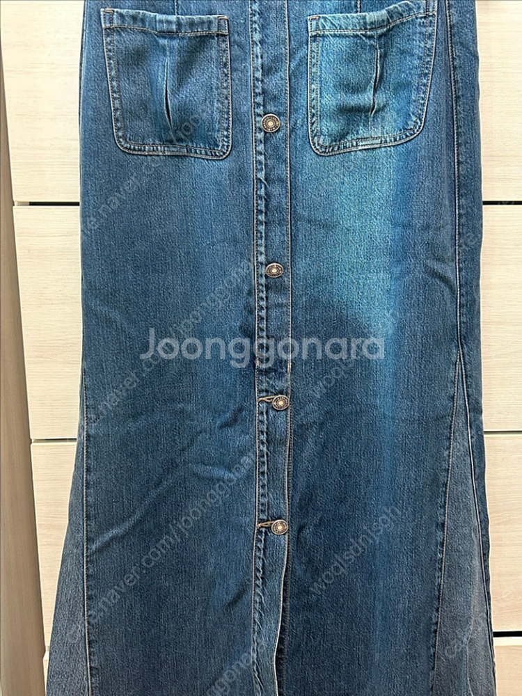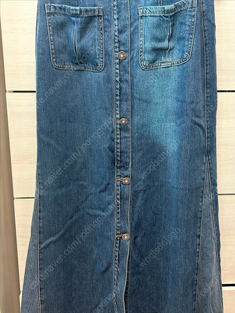 클래식한 데님 롱 스커트예요. 앞면 버튼 디테일과 포켓이 있어서 실용적이고 스타일리시해요. 전체적으로 상태 양호하고 새것같으실겁니다.부드럽게찰랑거리는스타일입니다.키164이상인분 추천요..55사이즈