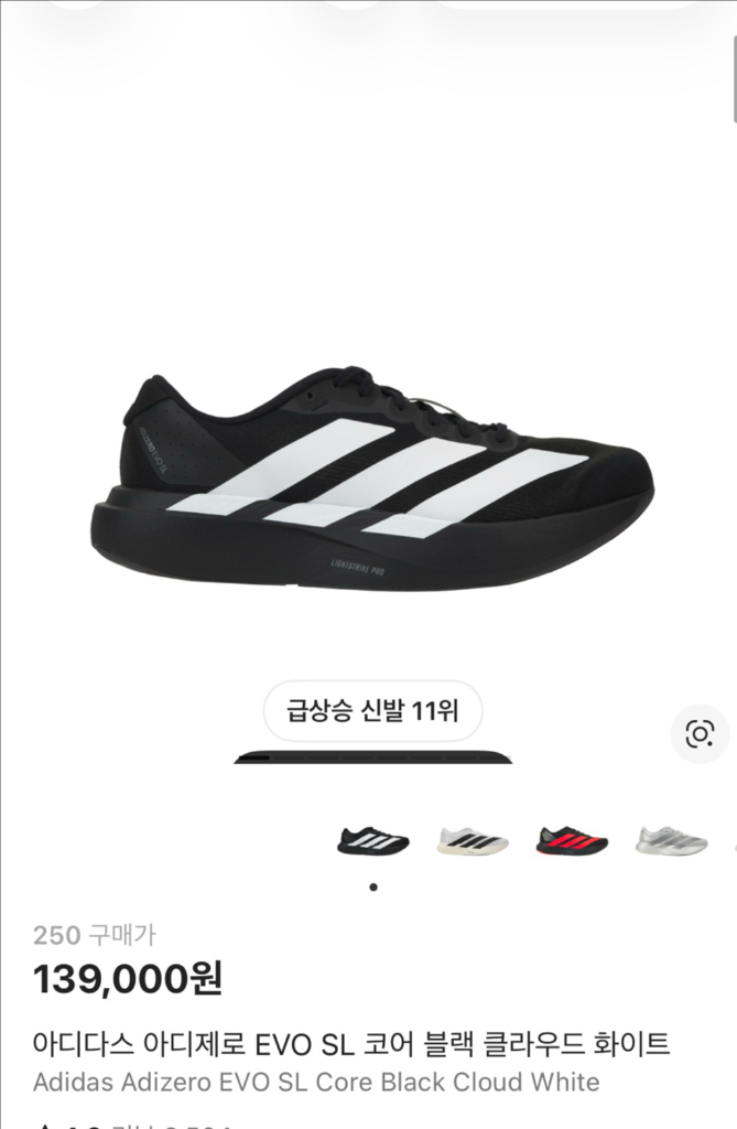 아디다스 에보sl 250 코어블랙 색상입니다 산지 한달도 안됐습니다 신고 20km정도 뛰었습니다 저한테커서 판매합니다