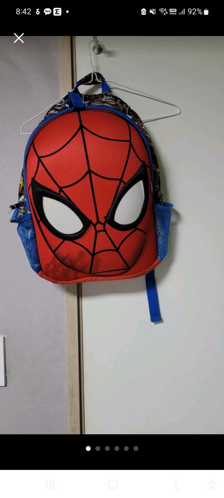 마블 스파이더맨 아동용 백팩입니다.앞면은 스파이더맨 얼굴 디자인이고, 옆면은 스파이더맨 만화 스타일 그림이 있어요~