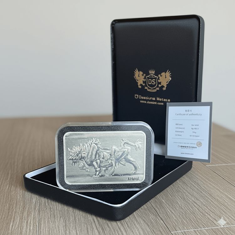 (한정판)대성 100g 실버바(이중섭 흰소) 판매. 전용케이스. 보증서는 풀 구성. 상태 좋습니다. 또는 이중섭 흰소100g +골드앤 100g 1개과 gbk 골드바 2개와 교환 가능. 네고 문의 사절.
