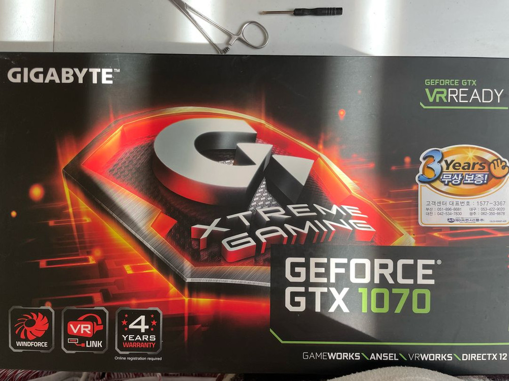 기가바이트 Gtx1070 8GB Xtreme gaming 모델입니다 구매했을 당시 구성품 전체 다있고 설명서,아대 같은 것도 그대로있습니다 네고 안받아요