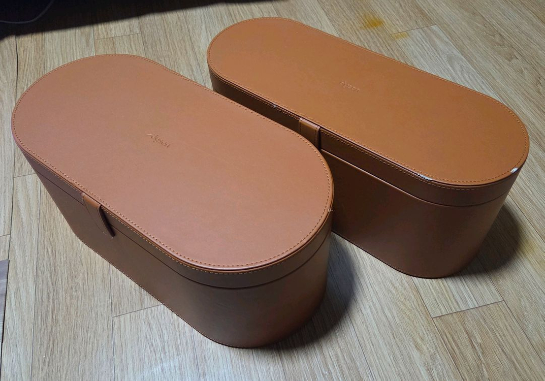 에어랩 컴플리트와 컴플리트롱 두 제품의 보관통입니다 사진에 있는 설명서 있는 구성품들은 1개씩만 있습니다 가죽재질의 무게감 좀 있는 보관함이라 고급감있어 에어랩 외에 다른물품 보관용도로 쓰기도 좋습니다 컴플리트롱 보관함 뚜껑쪽 가장자리 벗겨짐 사용감 조금씩 있습니다