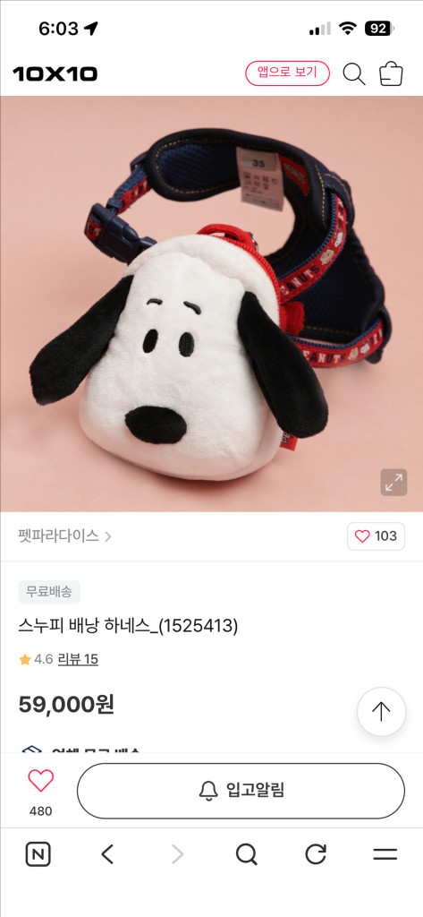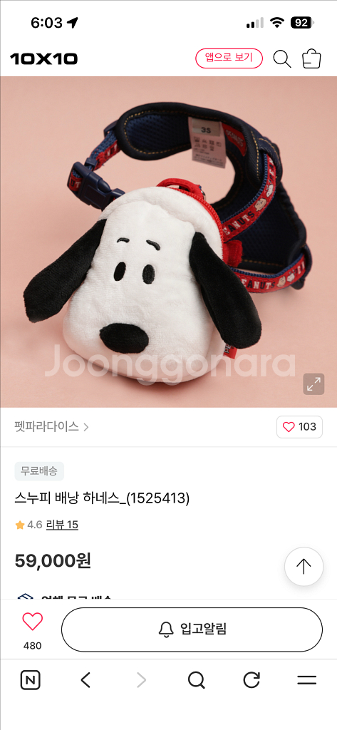 강아지 가방 하네스 스누피