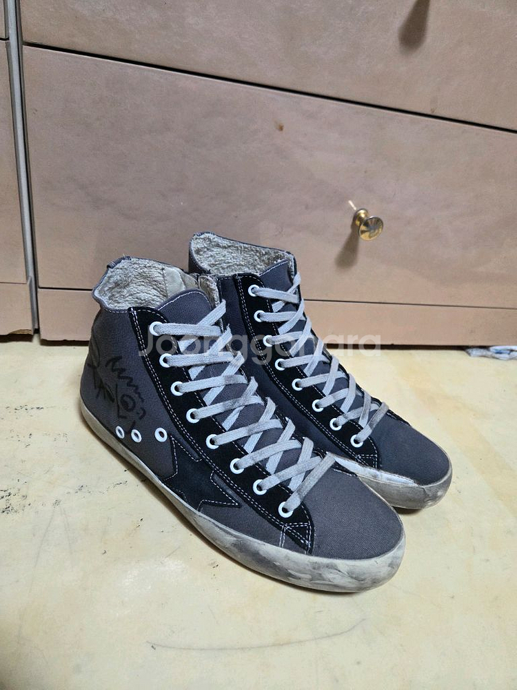 골든구스 스니커즈 남성용입니다 원산지ㅡ이탈리아수입 100% 오리지널 정품 정규 매장 판매용 확실한 정품으로 정품 아니거나 하자 조금이라도 있으면 200%배상하고 바로 반품받습니다 ㆍ연락처 01087600595 색상ㅡ 다크 그레이/ 블랙 소재ㅡCALF.송아지 가죽 41사이즈로 한국인 사이즈는 남성 260~265입니다 높이는 미들탑 또는 하이탑 정도이며 높이는 12센티입니다 가장 보편적인 디자인으로 가장 많이 팔리는 스테디 모델입니다 지퍼가 있어서 착용하기에 편리합니다 컨디션은 사진에 보이는 그대로 거의 새제품에 준하며 어느곳도 하자나 흠집같은것 전혀없이 완전 깨끗합니다 기스도 전혀없고 밑바닥도 사진과 같이 거의 닳지 않았습니다 완전 깨끗하니 세탁할 필요없이 그대로 착용하시면 되고 형태도 새거 그대로 완전 반듯합니다 사진상 그대로입니다 낙서(PAOLO)는 원래 제작시에 인쇄되어 나온 컨셉입니다, 옆면 사진 참조 택배비포함 130000원입니다 단품으로 직거래 가능합니다 도봉구 쌍문3동 전철은 쌍문역 차로 오시면 한일병원 입구가 좋습니다 익일도착 우체국 등기 특송하고 송장도 찍어 보내 드립니다 군데 군데 흠처럼 보이는 부분은 원래 빈티지 컨셉인지는 다 아실것입니다