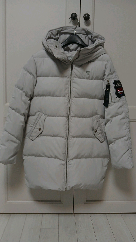 GUESS 키즈 패딩입니다 - 사이즈는 155입니다 - 그레이색상입니다. 후드가 달려있습니다 - 팔 부분에 패치 디테일이 있습니다 길이74cm 상태 좋아요