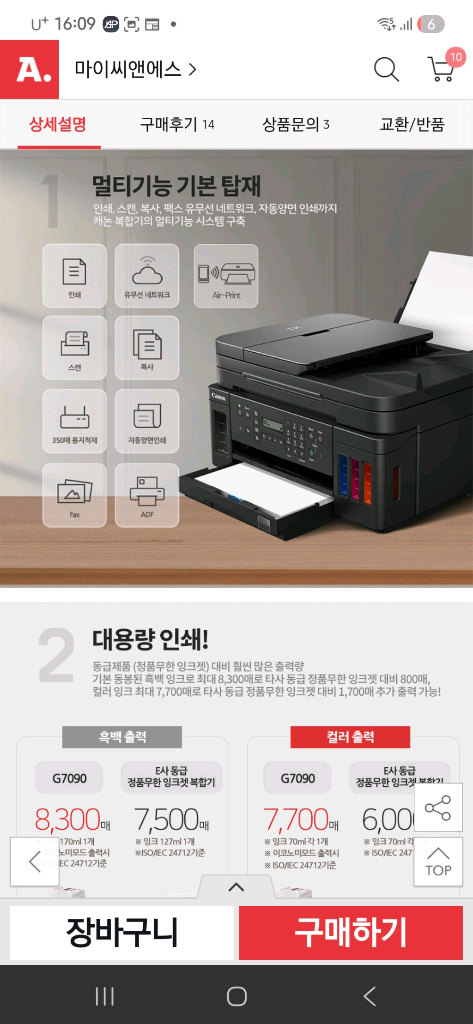 [정품] 캐논 G7090 무한 복합기 팩스 , wifi, ADF. 복사 스캔 인쇄 작동잘됩니다 모델명 캐논 G7090 구성품 본체 전원선 usb 연결선 상태 좋습니다 잉크잔량 4색 모두 가득 최대 흑백 8,300매, 컬러 7,700매 인쇄 가능 🍒필독 ㅡ오른쪽 컬러 잉크통 전면 커버 분실 됐지만 사용에는 문제 없습니다 (마지막사진 참고 하세요) ㅡ 검정 해드는 새거로 교체 했어요 ㅡ 잉크가 가득있어 샐수 있어서 안산 선부동 직거래만 가능합니다 🍒특장점 - 인쇄, wifi. 팩스 ADF. 양면 인쇄, 스캔,복사 기능까지 갖춘 전천후 복합기 - Air-Print를 지원하여 편리하게 인쇄할 수 있습니다 - 자동 양면 인쇄 기능으로 용지를 절약할 수 있어요 - 흑백 8,300매, 컬러 7,700매까지 넉넉하게 출력 가능합니다 집에서만 사용해서 전체적으로 깨끗하고 작동잘됩니다 테스트완료 🍒생활기스 사용감 있으니 민감하시면 패스하세요 🌀안심 결제 하시면 됩니다 직거래는 안산 선부동이며 공1공 ㅡ 팔천 ㅡ 오이일일 입니다 단순 교환X 변심 X반품X 안됩니다