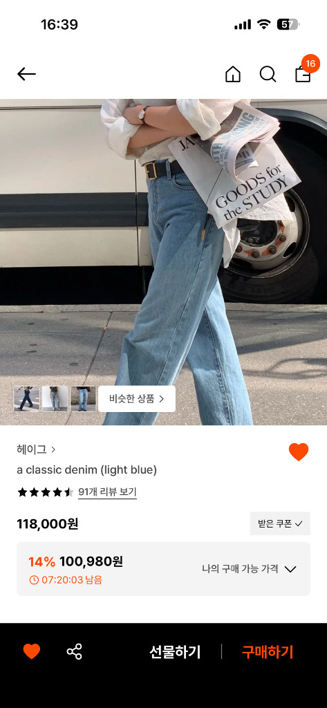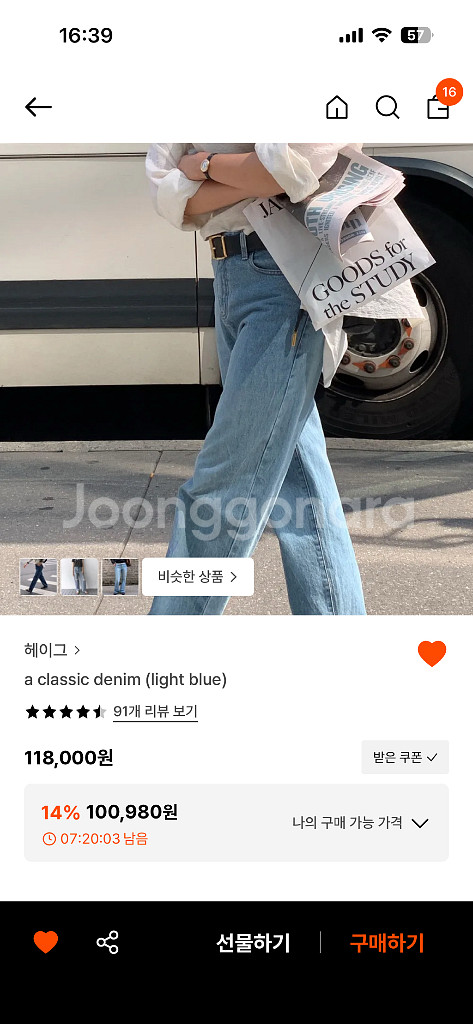 그haag 클래식 데님 S사이즈에요. 정가 118000원 입니다. 사이즈 표기는 사진에 드렸습니다! 핏 엄청 예쁘고 넉넉하게 입을수있어서 요즘 코디에 딱이에요! 저는 핏이아쉬워서 M사이즈로 재구매하려고 판매합니다! 빠르게 처분하고 다시 사고싶어서 저렴히내놓아요! 착용감은 5회정도입니다 :) 구매는 7월초에했어요. 배송은 반값택배로 하시면 무료로 해드릴게요!