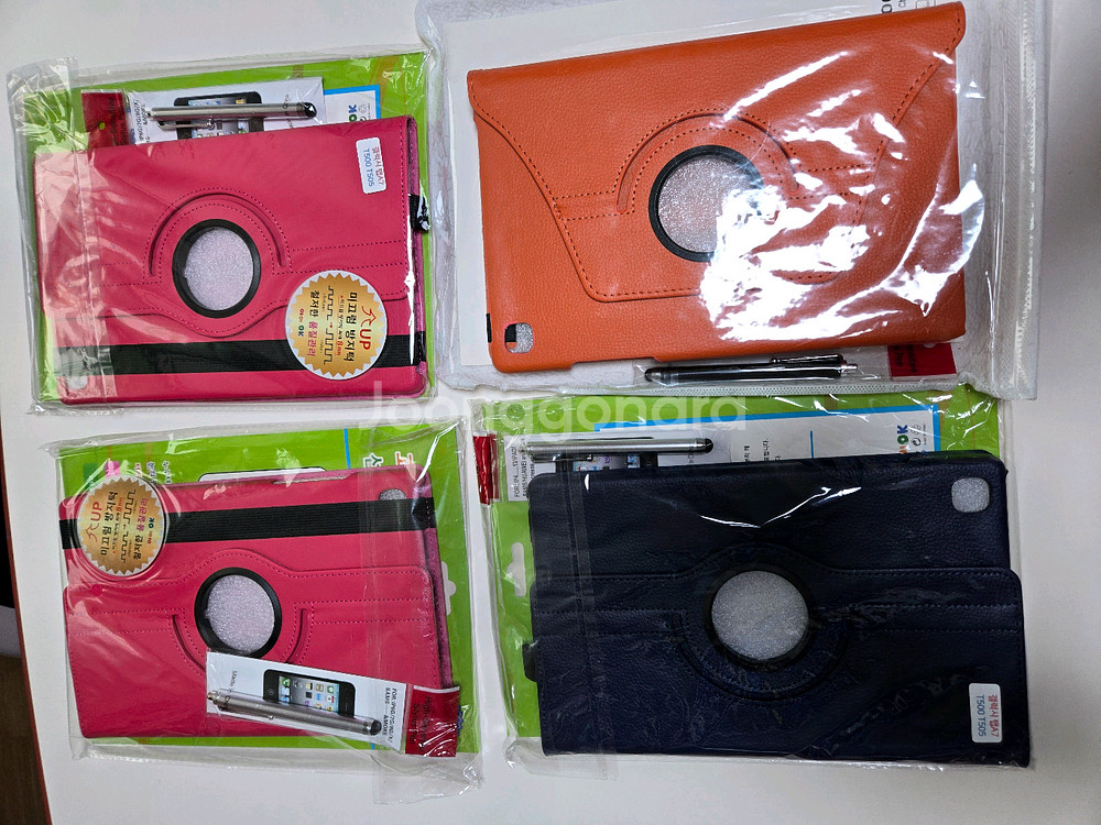 새 제품 태블릿 케이스입니다 갤럭시 sm-t500 제품입니다 다양한 색상 (핑크, 오렌지, 네이비) 준비되어 있습니다 터치펜 포함 3개는 한번쯤 패드입혀본 케이스도 함께 보내드립니다. 총7개입니다 새것4개 +새것같은3개(라운지에서 견본용전시로사용) 우체국택배비포함입니다