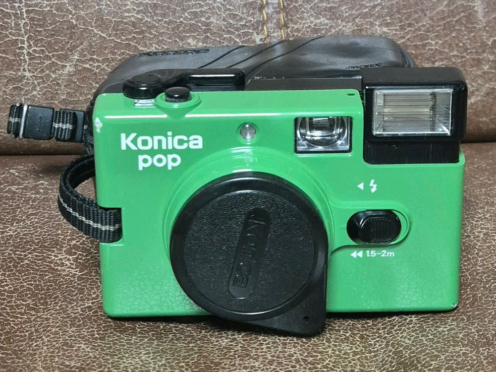 현재 작동해보니 기기는 정상작동합니다. (후레쉬 작동시 올라오는게 장력부족인지 퍽 올라오진않지만 잘 터집니다) 사진 속 카메라는 1982년에 출시되어 선풍적인 인기를 끌었던 코니카 팝(Konica Pop) 모델입니다. 당시 젊은 층을 겨냥해 다양한 색상으로 출시되었는데, 사진 속 초록색은 그중에서도 꽤 매력적인 컬러죠! 이 카메라에 대해 핵심만 짚어드릴게요. 1. 주요 특징 렌즈: '코니카 헥사논(Hexanon) 36mm f/4' 렌즈가 탑재되었습니다. 보급형 카메라임에도 불구하고 렌즈 성능이 꽤 준수해서 결과물이 선명하고 진득한 색감으로 유명합니다. 포커스 프리: 초점을 직접 맞출 필요가 없는 '고정 초점' 방식입니다. 약 1.5m 이상 거리만 확보되면 사진이 선명하게 찍힙니다. 수동 손맛: 필름을 한 장 찍을 때마다 오른쪽 상단의 레버를 직접 돌려 감아야 합니다. 디지털과는 다른 아날로그적인 재미가 있죠. 2. 사용 전 체크사항 건전지: AA 건전지 2개가 들어갑니다. 하지만 이 건전지는 플래시를 터뜨릴 때만 사용됩니다. 셔터 자체는 기계식이라 건전지 없이도 사진을 찍을 수는 있지만, 어두운 곳에서는 플래시가 필수이니 넣어두는 게 좋습니다. ISO 설정: 렌즈 주변의 검은색 링을 돌려 필름 감도(ISO 100, 200, 400 등)를 직접 맞춰야 합니다. 그래야 카메라가 빛의 양을 적절히 조절합니다. 플래시: 앞면에 있는 검은색 슬라이드 스위치를 옆으로 밀면 플래시가 '툭' 하고 위로 튀어 오릅니다. 3. 이런 분들께 추천해요 필름 카메라에 처음 입문하시는 분 (조작이 매우 쉬움) 가벼운 스냅 사진을 즐기시는 분 레트로한 디자인을 소품처럼 활용하고 싶은 분