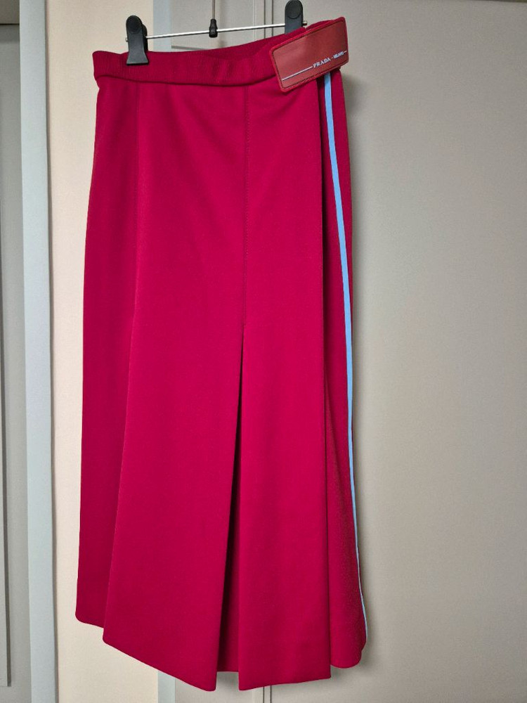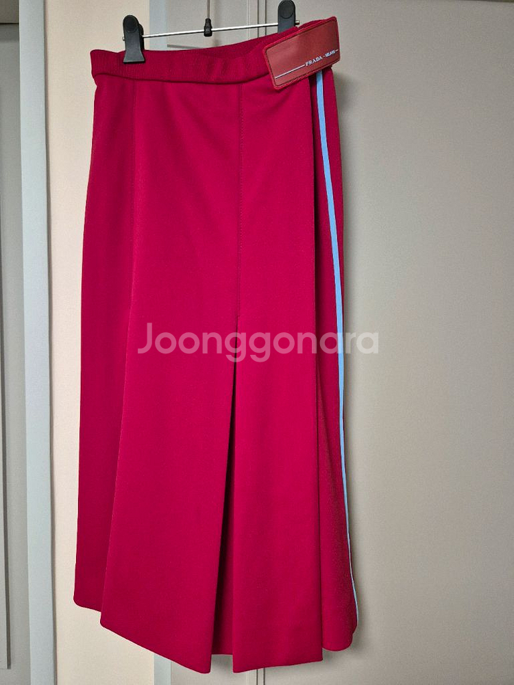 프라다 랩 롱스커트입니다 사이즈 42이며 실측치수 참고하세요 안쪽에서 묶어고정한후 프라다로고벌크로로 고정합니다 뚝떨어지는 드레이프 고급스럽습니다 색상은 찐빨강 예쁜레드입니다
