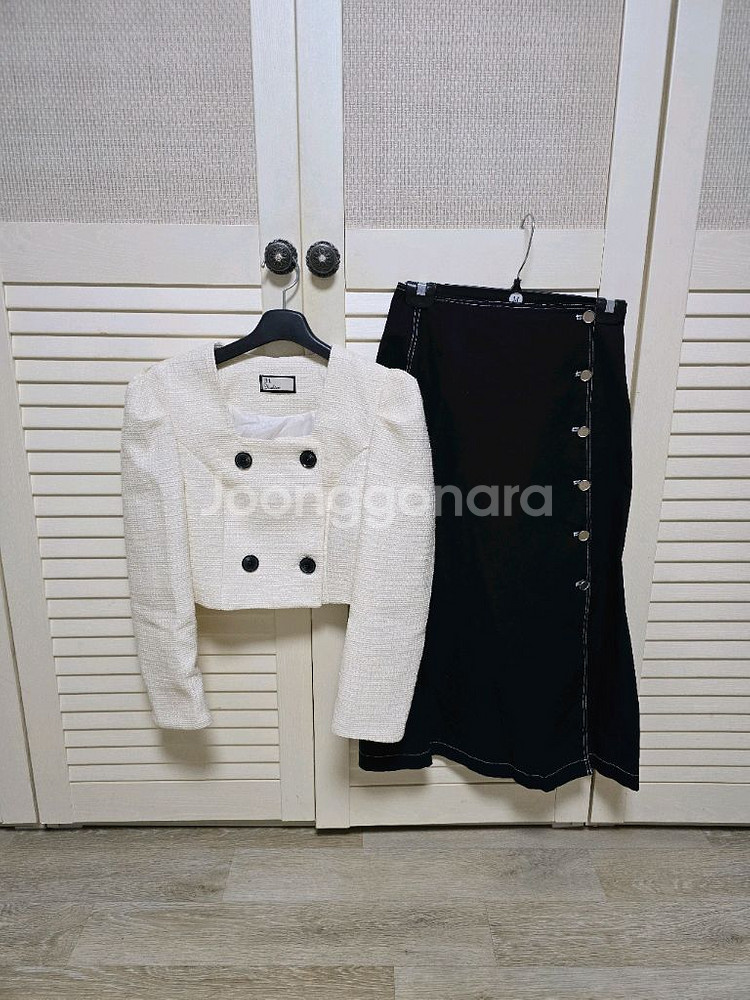 퍼프소매 자켓과 블랙 스커트 세트 아이보리 퍼프소매 자켓과 블랙 스커트 셋업입니다. 자켓은 크롭 기장으로, 스커트는 옆트임 디테일이 있습니다. 데이트룩이나 하객룩으로 활용하기 좋은 옷이에요. 자켓은 새거구요 스커트는 한두번 입어 상태좋아요. 같이 묶어 저렴하게 판매할께요. 55사이즈 세트가격 : 27000원 배송비 : 3000원