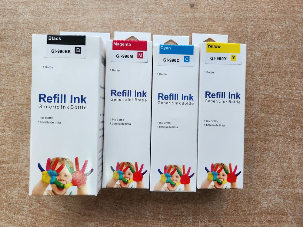 재생 잉크 카트리지 4개 세트입니다. 블랙, 마젠타, 시안, 옐로우 색상 모두 포함되어 있어요. 새 제품