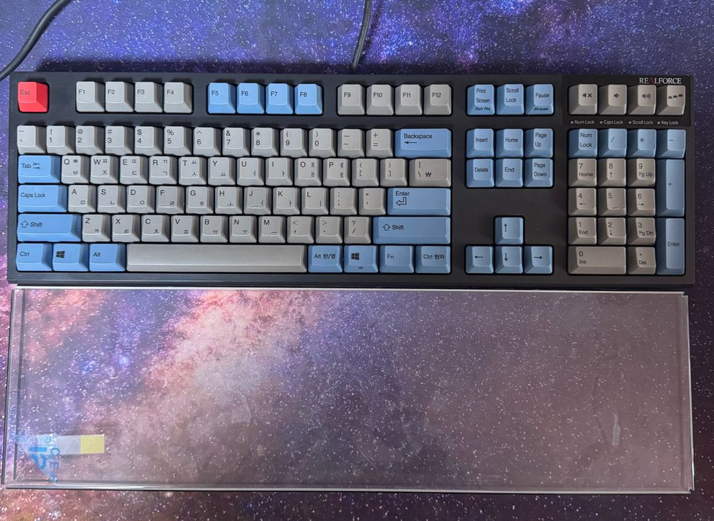 REALFORCE SA R2SA-KR4-BK-L 키보드 판매합니다 - 블랙 (키캡은 블루 그레이) Esc 포인트 키캡도 있음 - 45g 키압으로 부드러운 키감을 제공합니다 - APC(Actuation Point Changer) 기능으로 키 입력을 조절할 수 있습니다 - US 레이아웃 108키 (Korea) - 윤활된 제품 - 저소음이나 기계식 키보드 저소음의 밋밋한 키감과는 달리 충분히 초콜릿 부러뜨리는 키감을 느낄 수 있습니다. - 사진에 보이는 갤팩 키보드 덮개도 같이 드립니다. - 키보드 덮개는 별도 구매시 약 35,000원 정도 가격입니다. 안심결제시 5,000원 추가 구성품은 키보드 본체, 키캡, 키캡 리무버 등 박스 일체입니다.