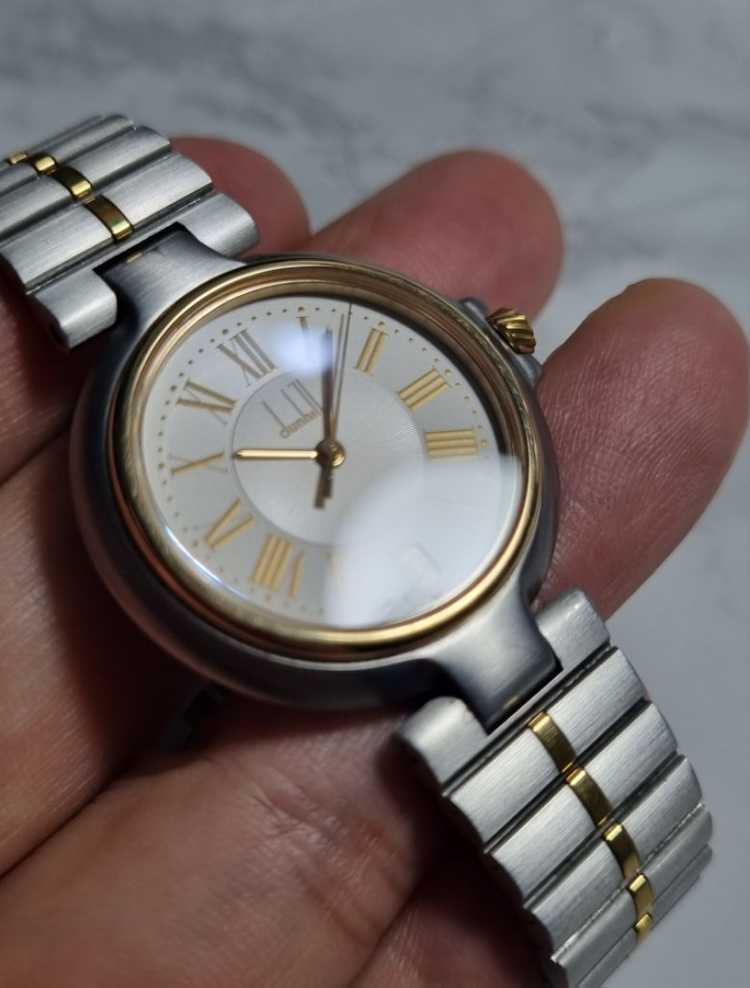 영국의 최고명품 던힐시계에요 로만다이얼이 금장으로 되어있어 정말고급스러워요 콤비도 흔하지않은 메탈줄 중앙에 심플하게 장식되어있네요 상태 좋습니다 30mm정도되는거같고 줄은 16cm까지 가능합니다 남