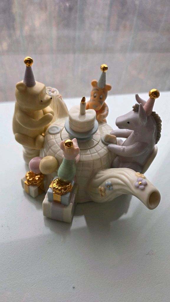 미사용. 아끼던건데 이번에 티팟위로 물건 떨구는바람에 케익(뚜껑) 초 부분하고 티거 삼각모 부분 떨어져서 리페어했습니다 케익 안쪽에 뾰족이부분은 원래 그렇습니다(8번사진) 30가까이주고 샀는데 5만원에 내놔요 사진 잘봐주세요 사진 더 원하시면 문의주세요 골드부분 24k입니다 보증서 모두 있고 박스는 없습니다 정리중이라 환불불가해요 택포